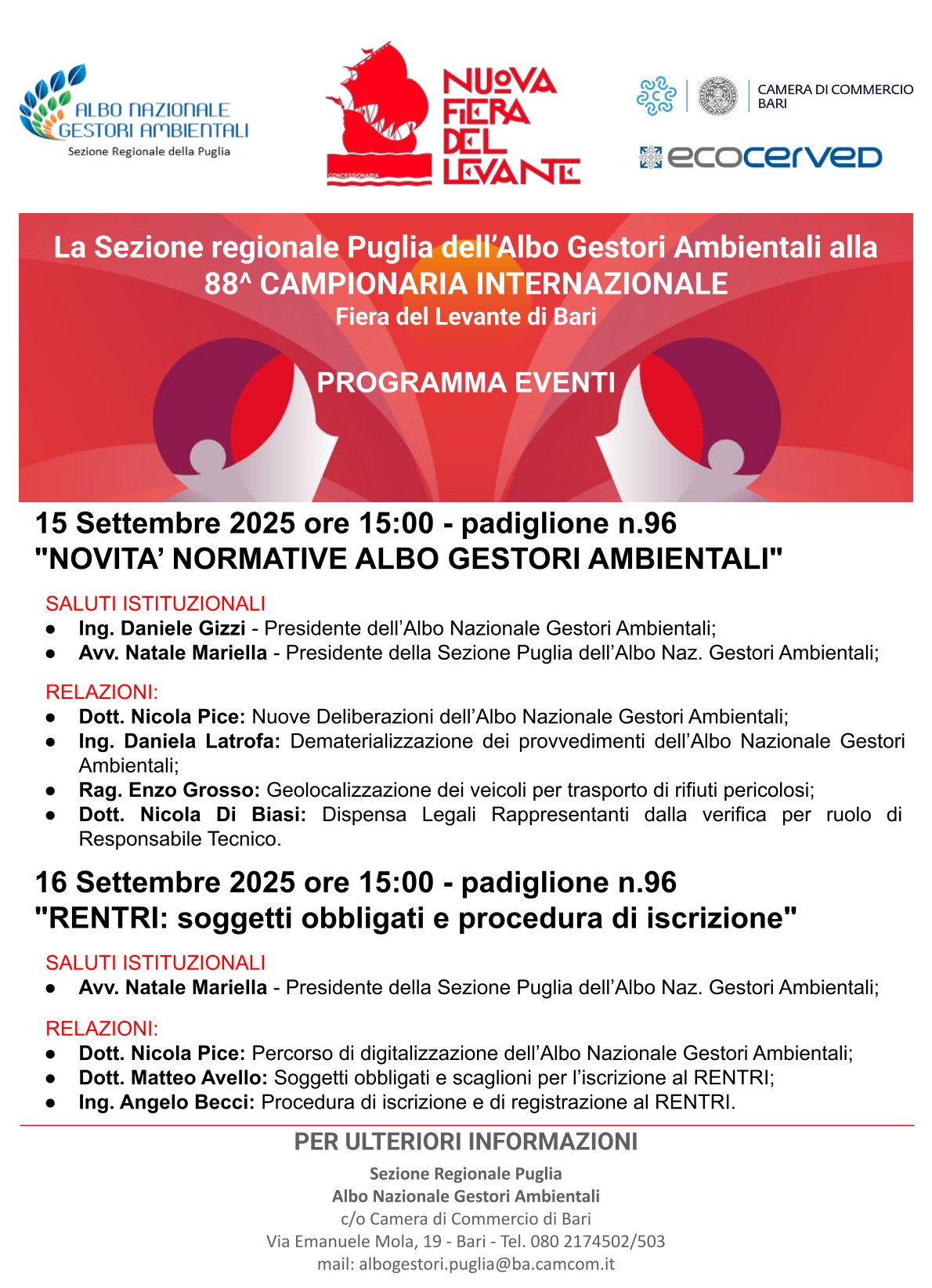 La Sezione regionale della Puglia dell’Albo nazionale gestori ambientali, d’intesa con il Comitato nazionale presso il Ministero dell’Ambiente e della Sicurezza Energetica, parteciperà alla 88^ Campionaria Internazionale - Fiera del Levante di Bari, prevista dal 13 settembre al 21 settembre del 2025, con un proprio stand istituzionale ubicato nel padiglione 96. All’interno dello stand sarà presente un help desk a disposizione degli stakeholders di riferimento e un’area dedicata agli eventi informativi.